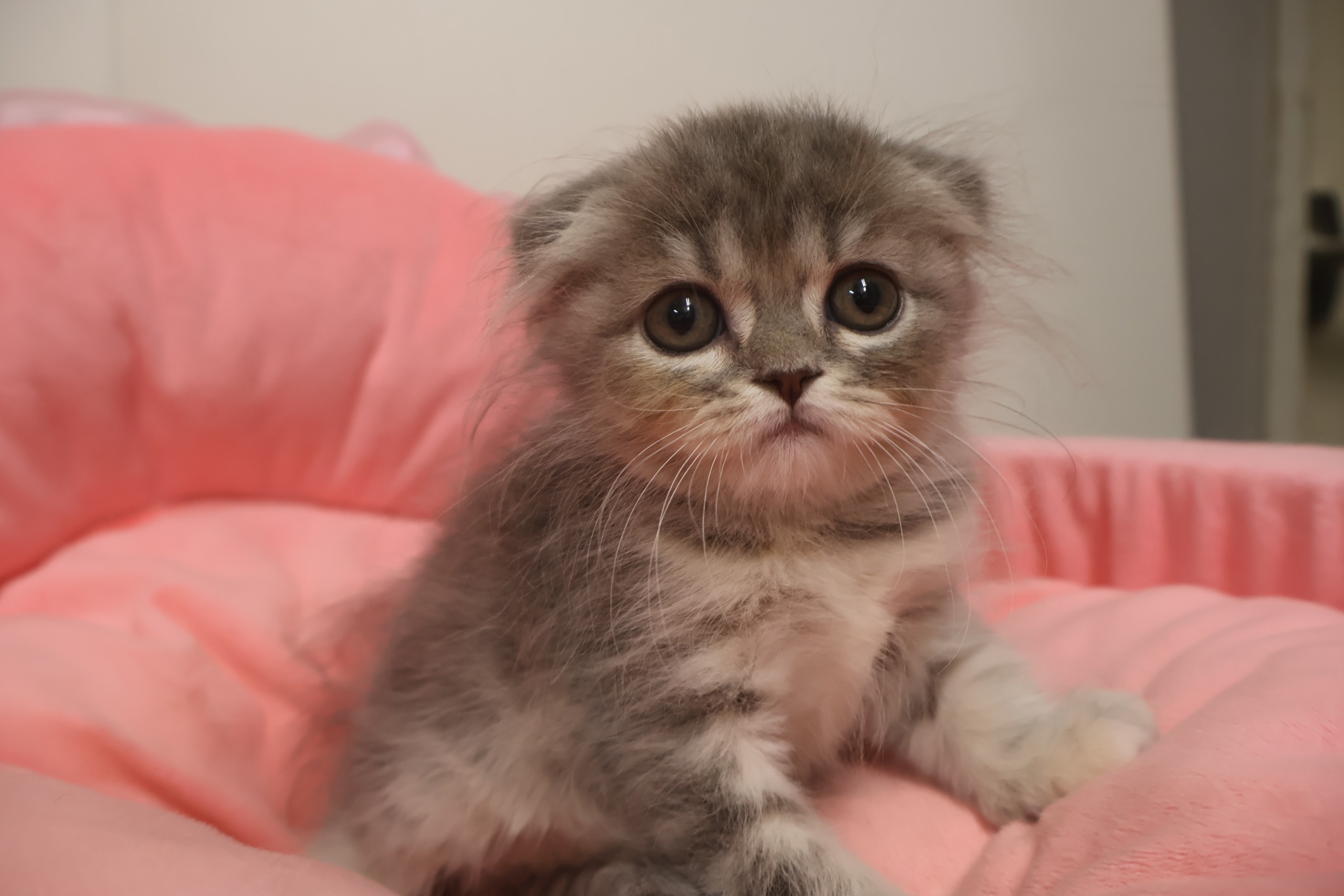 ブルーパッチドタビー 折れ耳 長毛 人気のブルー系☆お顔真ん丸の可愛い女の子☆