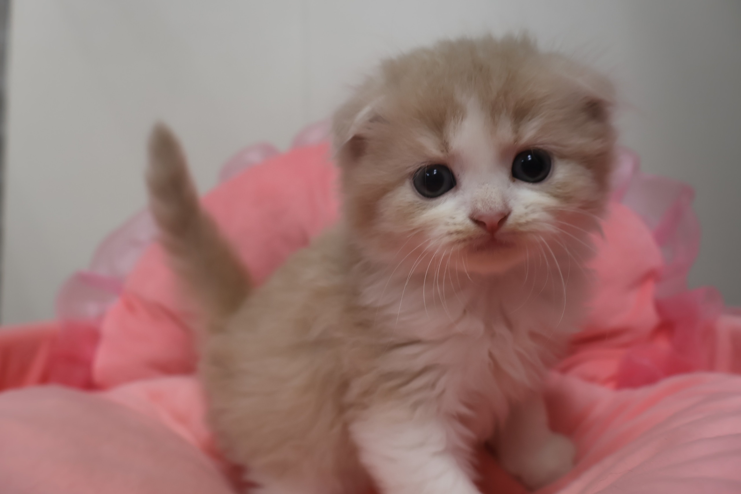 ☆自家繁殖☆ クリームタビー&ホワイト 折れ耳 長毛 人気のクリーム系☆お顔真ん丸の可愛い男の子☆